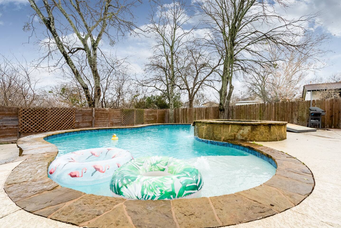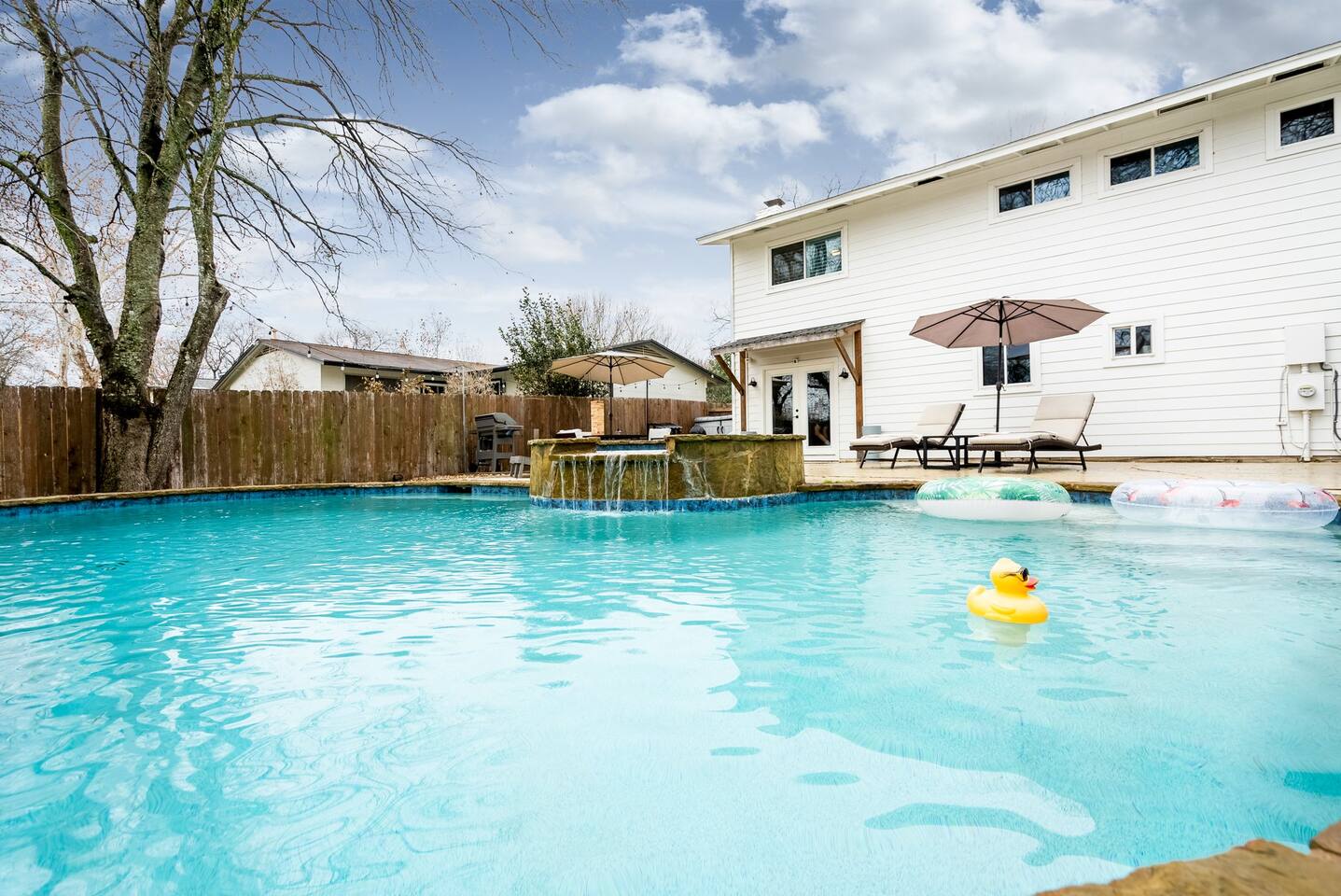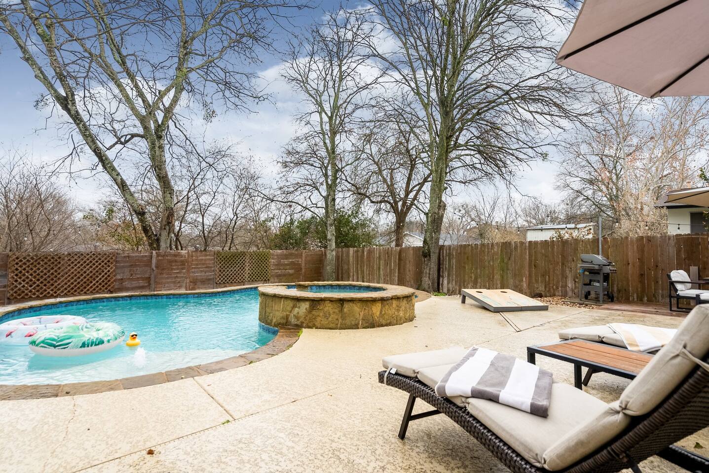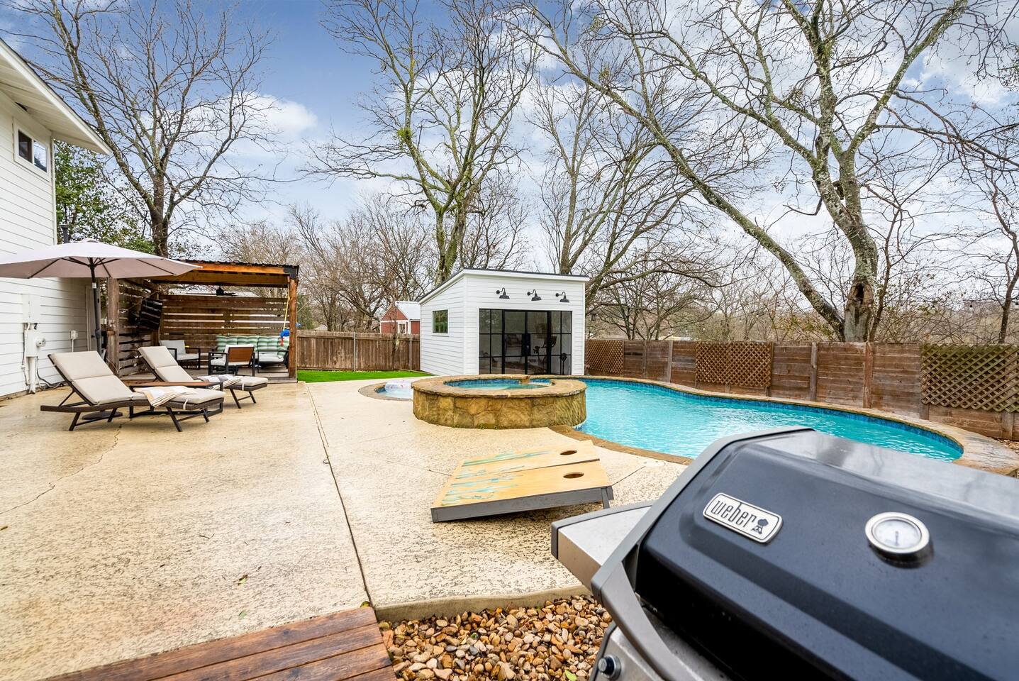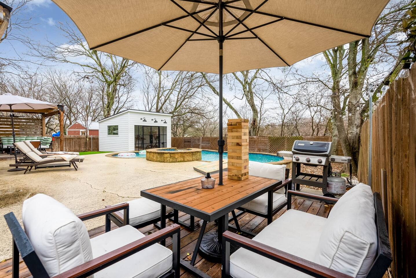 ★★HOME OVERVIEW★★ Luxury, family-friendly home with 3 bedrooms + Pool House that acts as 4th Bedroom, 2.5 bathrooms, Fast Wifi, Smart TVs, Fully Stocked Kitchen, Outdoor Patio w/ TV & Fire Pit, Peloton and other fitness gear, and much more! Book with us for an amazing time - we are less than 10 minutes from the center of Downtown Austin plus very close to the Hill Country! ★★SIMPLE CHECK-IN & DIGITAL GUIDEBOOK★★ We have traveled all over and know the struggles of navigating a new place for the first time and trying to find an Airbnb late at night after a long day of travel - that is why we provide a very easy self-check-in that includes pictures and videos so you won't feel like are in the middle of a scavenger hunt.....our Digital Guidebook also provide recommendations of the best things to do, see, and eat while in the Austin Area and Hill Country! ★★ SMART TV'S★★ Smart TVs - Blazing Fast 300 MB/S Internet.......there is also an Outdoor TV so you can continue watching the game outside while swimming in the pool or grilling for the family! ★★SLEEPING ACCOMMODATIONS★★ Master Bedroom: King Bed Bedroom 2: 2 Twin Beds or we can make it a King Sized Bed Bedroom 3: Queen Bed - It is a Murphy Bed so can be hidden as well Bedroom 4: Couch + Deluxe Queen Sized Air Mattress in Pool House w/ AC & Heat & Curtains for complete privacy. We also have a Pack N Play for kiddo and a very comfortable Queen Air Mattress for 2 additional guests. We can host up to 10 people comfortably. ★★LIVING ROOM★★ You'll love this living room with a comfortable couch, Large Smart TV w/ Netflix etc, and a deluxe Queen Sized Air Mattress for 2 more people to sleep comfortably. ★KITCHEN★ You will have everything you need to make meals for a large group! This modern kitchen has a full-sized oven, stove, fridge, microwave, dishwasher, Coffee Maker, and all of the pots/pans, spices, and cooking oil you'll need! ★BATHROOMS★ 2 Full bathrooms plus an extra half bathroom means you and your friends will never need to wait on each other. ★DINING AREA★ We have a large table for 6 near the kitchen for big meals + additional areas to eat at the couch or kitchen bar. ★BACKYARD★ Our Backyard has everything you need to have an incredible time - the main highlight is the Pool/Hot Tub plus outdoor dining table, outdoor TV, Fire Pit, Cornhole & Other Games, plenty of fenced-in grass to let the kiddos run around & a Propane Grill to cook up a meal the family will love! ★PELOTON & FITNESS EQUIPMENT★ We have a Peloton Bike and some adjustable Bike Pedals that will allow you to do the biking portion of the Peloton workout in your regular tennis shoes - not interested in biking.....no problem, there are several other workouts available including Yoga and Strength Classes....we also have a treadmill and weights so you can stay fit even while eating that delicious Texas BBQ! ★LAUNDRY ROOM★ We have a large Washer & Dryer that you will have access to for your personal laundry. ★RESTAURANTS★ There are an unlimited amount of restaurants within a 10-minute drive + a ton of - we will provide recommendations for our favorite places to eat/drink/explore in the area and in nearby Austin! In an effort to be good neighbors, please keep the outdoor volume reasonable after 10 pm or move the fun indoors.