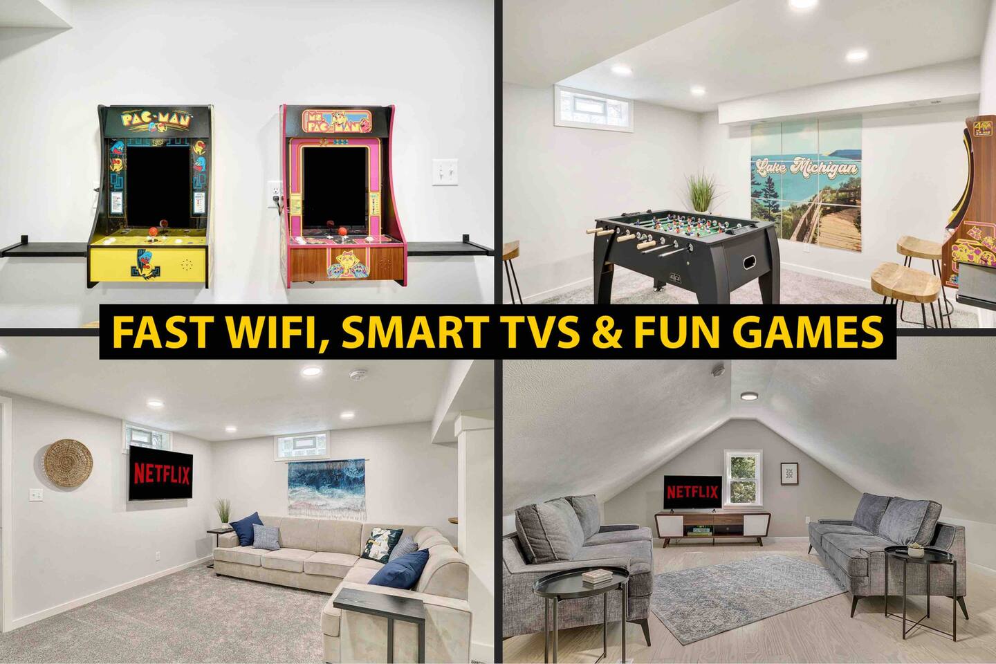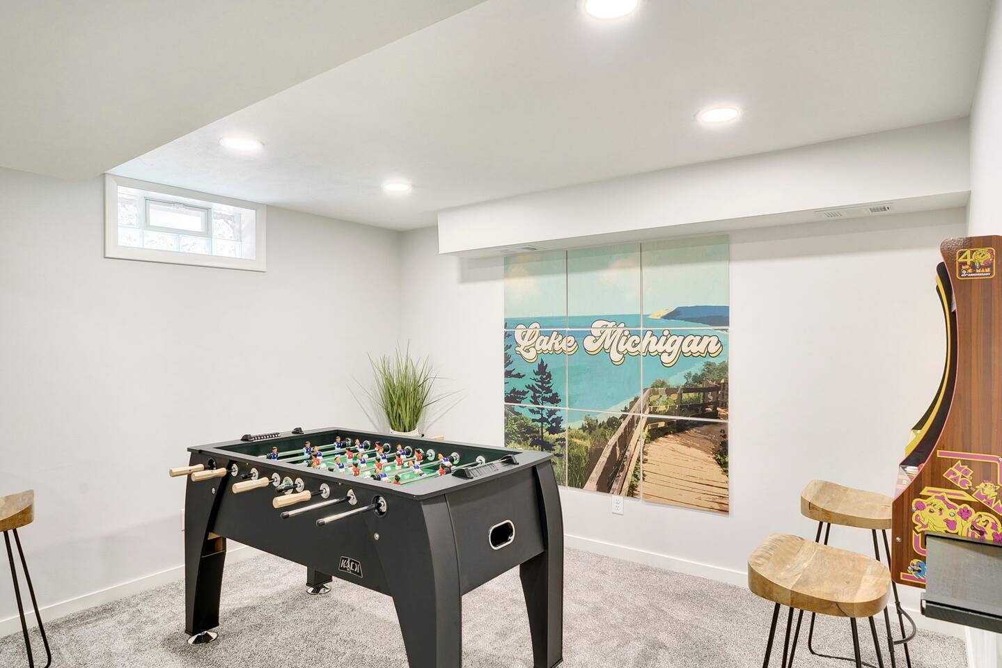 ★Book with SWAP CoHosting for an incredible time★ ★HOME OVERVIEW★ You'll love this sun filled home that is 2 blocks away from Muskegon Lake & only a 5 minute WALK from Pere Marquette Park (Lake Michigan Sandy Beach). The home is a short drive to a lot of great restaurants/shops and only 25 minutes to Grand Haven if you want to take a day trip there. ★Simple Check-In and Digital Guidebook★ We have traveled all over and know the struggles of navigating a new place for the first time and trying to find an Airbnb late at night after a long day of travel - that is why we provide a very easy self check-in that includes pictures and videos so you won't feel like are in the middle of a scavenger hunt.....We also have pictures of how everything works in the home so you'll never wonder "how does this thing turn on". ★SLEEPING ACCOMMODATIONS★ Bedroom 1: King Bed Bedroom 2: FOUR Twin Beds Bedroom 3: Queen Bed Bedroom 4: Queen Bed Downstairs Living Room: Couch that turns into a Queen Fold Out Bed Upstairs Living Room: Two Couches that can be slept on We also have a Pack N Play & high chair for the little ones! ★LIVING ROOMS★ There are 2 living rooms - one is downstairs with a large Smart TV, Foosball, 2 Arcade Games, and a huge couch that turns into a queen-sized bed. The upstairs living room has a Smart TV, 2 couches that fold down to beds, and a large play area for the kiddos! ★KITCHEN★ You will have everything you need to make meals for a large group! This remodeled modern kitchen has a full-sized oven, stove, fridge, microwave, dishwasher, Keurig Coffee Maker, and all of the pots/pans, spices, and cooking oil you'll need! ★BATHROOMS★ 2 Full bathrooms means you and your friends will never need to wait on each other. One bathroom is upstairs and the other one is in the basement making it perfect for spraying off at a day at the beach!! ★DINING AREA★ We have a large table for 8 near the kitchen for big meals + additional areas to eat at the couch or in the sun room. ★RESTAURANTS★ There are a lot of restaurants within a 10-minute drive including several on the water - we will provide recommendations for our favorite places to eat/drink/explore in the area! ★LAKE★ You will be able to walk to Muskegon Lake in 3 minutes and to Pere Marquette (Lake Michigan Beach) in just 5 minutes! We will provide our recommendations for SUP, kayak rentals and our favorite spots for watching a beautiful sunset!!! In an effort to be good neighbors, please keep the outdoor volume reasonable after 10pm or move the fun indoors. This is an older home so you may notice some creaky floors, doors that stick etc. - none of this will impact your stay but we wanted to let you know about it.